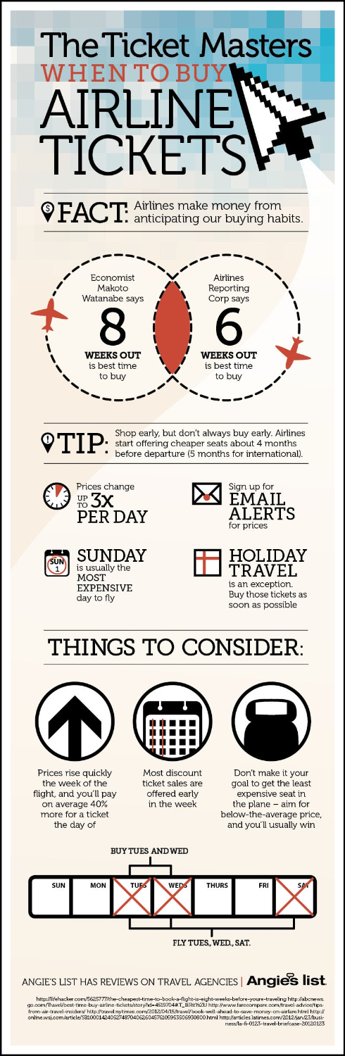 Experts agree that 6 to 8 weeks out is the best time to purchase airline tickets.