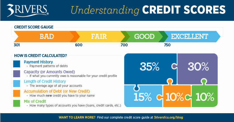 Most credit scores range from 301-850, with “bad credit” being any score below 600, “good credit” being between 700-749, and “excellent credit” being at 750 or higher.