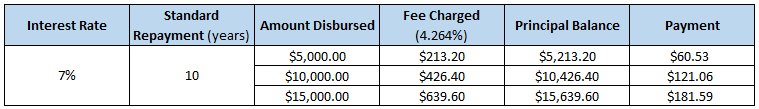 For the 2017/2018 school year, the interest rate offered to all applicants is 7%. There is an additional 4.264% fee on all disbursements, so for every $1,000 disbursed, the borrower is charged $42.64.